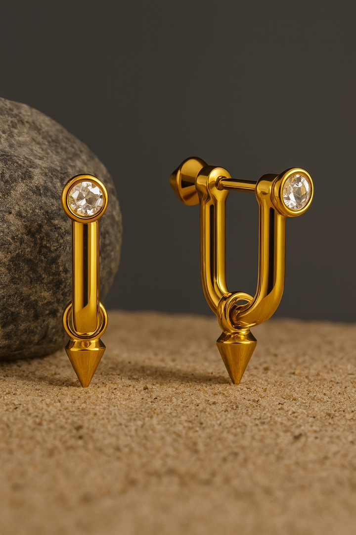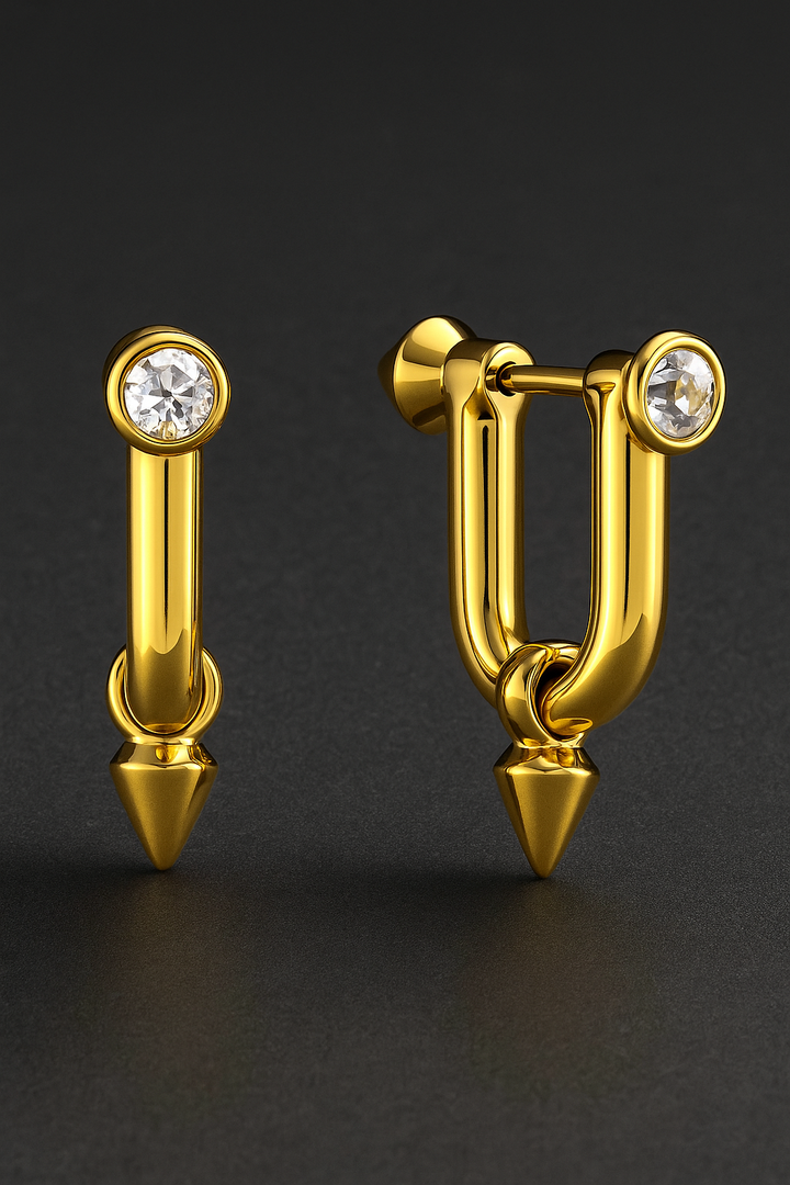Elevate your look with the Luna Spike Stud Earrings – where minimal elegance meets bold design. Crafted in a sleek gold-plated finish, each earring features a brilliant-cut stone at the top, flowing into a refined drop ending in a subtle spike. This combination creates a contemporary piece that is both chic and daring.